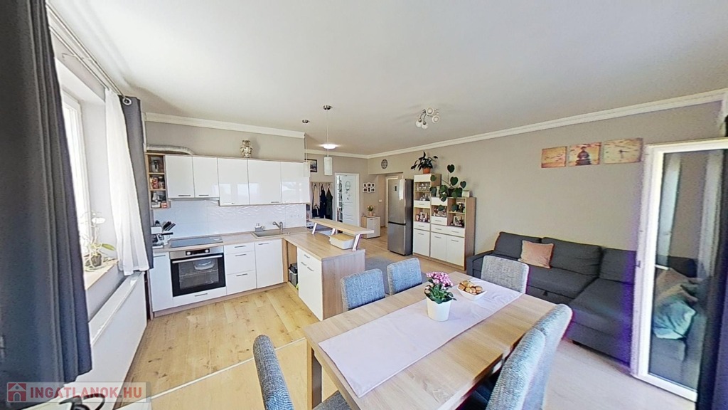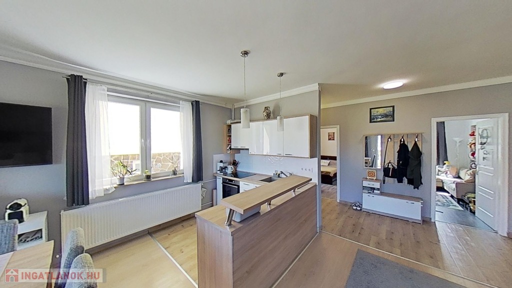 A szuterénszintről egy lépcsőn tudunk feljutni a lakószintre, melynek természetesen külön bejárata is van. Ezen a szinten a szülői háló, gyerekszoba, dolgozószoba és a nagy, amerikai konyhás, nappali-étkező osztozik. A szülői hálóból és a nappaliból is csodás panoráma nyílik a Bükk hegyeire, erdeire. A nappaliból nyíló fedett terasz a csodás kilátásával valószínűleg bármelyik család kedvenc helye lesz!