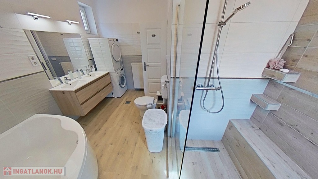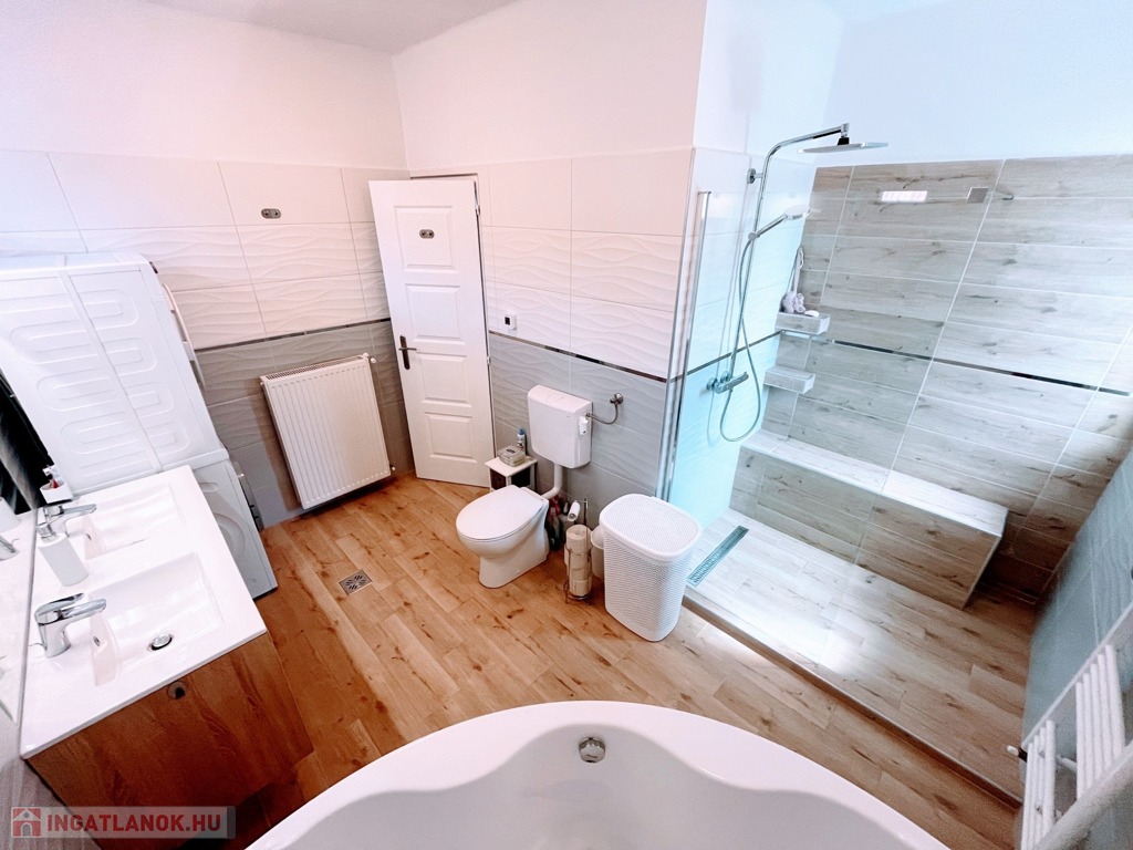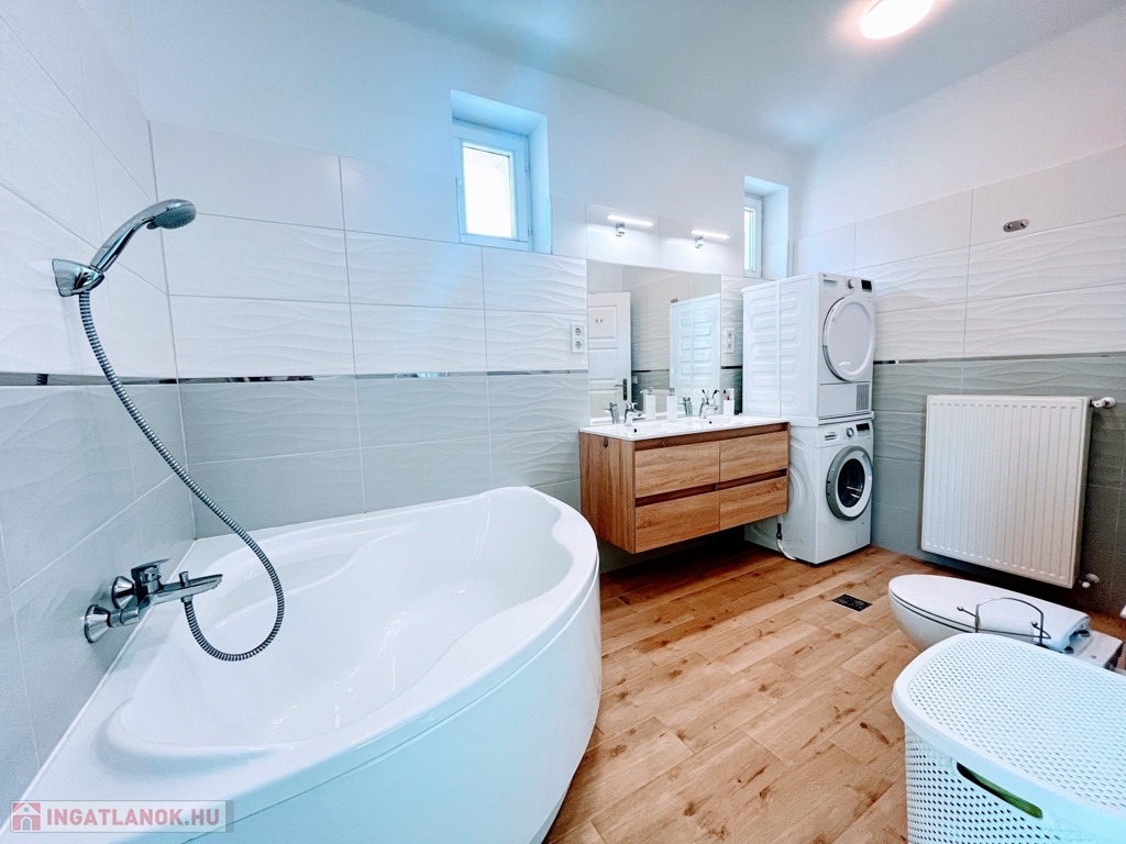 A nagyméretű fürdőben helyett kapott egy gyönyörű, erdei kilátással rendelkező zuhanyzó, egy sarokkád, wc, valamint egy dupla mosdó is. Természetesen egy külön wc is rendelkezésre áll még. A házban az összes szaniter minőségi, Hansgrohe termék.