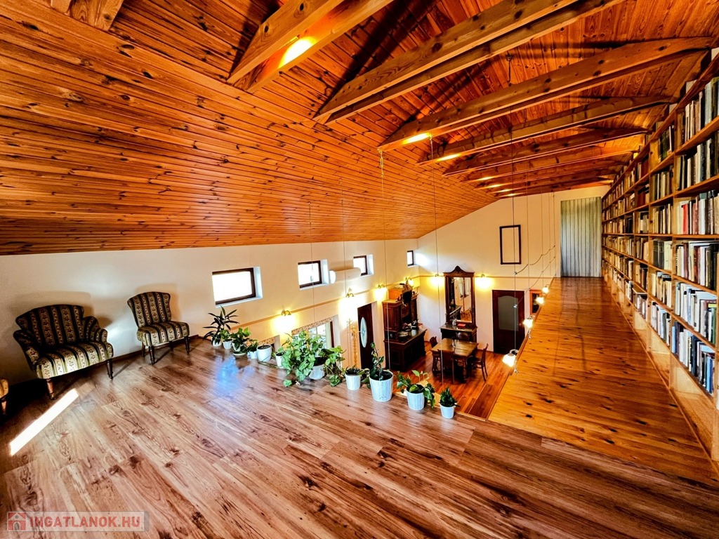 Az emeleten – mely látványos megoldásként szinte egybeolvad a földszinttel – található a galéria, 11 m hosszú könyvtár és a másik hálószoba. Igény szerint a galéria szobává alakítható.