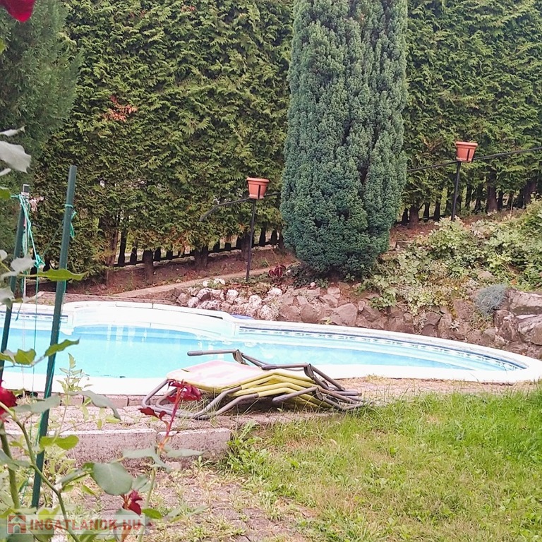 Az udvaron hangulatos, megvilágítható „fóliázott” (nem csempés) medence, fedett autóbeálló, tűzrakóhely, sziklakert, ősfák és dísznövények találhatók.