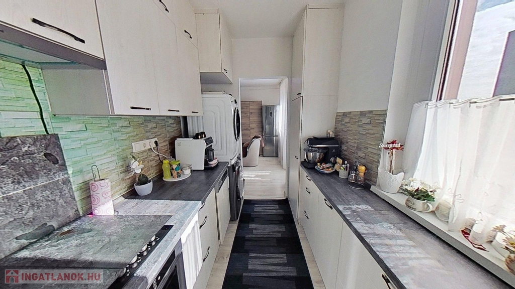 A felújítás keretében az ingatlan teljes belső átalakuláson ment át. A komplett konyha és fürdőszoba új arculatot kapott, új burkolatokkal, szaniterekkel, gépesítéssel (sütő és mosogatógép), konyhabútorral. Hangulatos LED világítás került minden helyiségbe, valamint tulajdonosa gondolt a nyári napokra is, a nappaliba felszerelt 3,5 kW-os Whirpool klímával. Felújításra került a teljes villamoshálózat, valamint a vízvezeték cseréje is megtörtént. Álmennyezetet alakítottak ki, illetve a nappaliban gipszkarton burkolatot kapott a lépcsőház felőli fal. Praktikus megoldásként a tér kedvező kihasználása végett beépített szekrény került az előtérbe, illetve a két szoba, a fürdő és az illemhelyiség bejáratai fából készült, helytakarékos, két elemből álló ajtókkal lettek felszerelve. Nyílászárói háromrétegű műanyag nyílászárók, melyek hővédő fóliával, redőnnyel, szúnyoghálóval vannak ellátva.