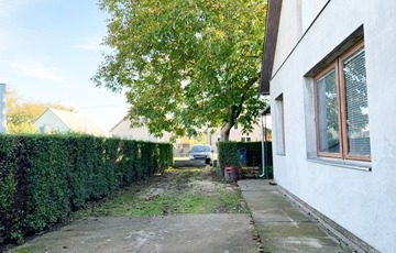 A kocsibejáró betonozott. A garázsok előtt hatalmas féltető, aminek hátsó fala fa tárolásra alkalmas. Emögött van a konyhakert.