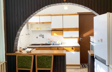 Az épület közepén nappali, mellette amerikai konyha.