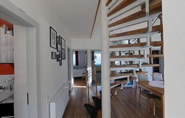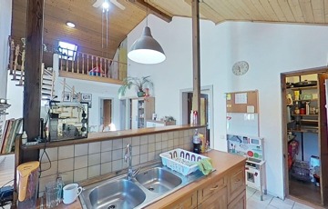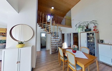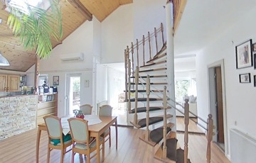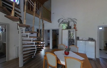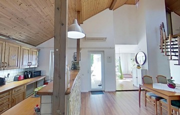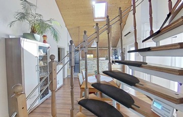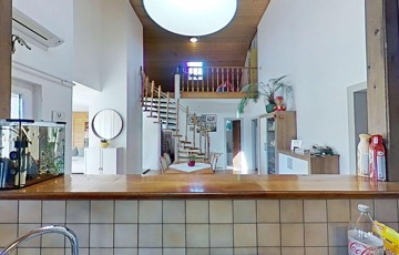 Korszerűsítése az egyedi kialakítása miatt is lényeges szempont volt, ugyanis a két szintet egy csigalépcső köti össze, így a konyha és nappali közötti rész 5,25 m-es belmagasságú, galériás, loft kialakítású, egy légtér.