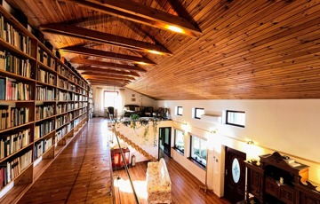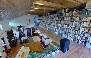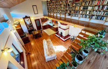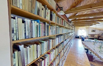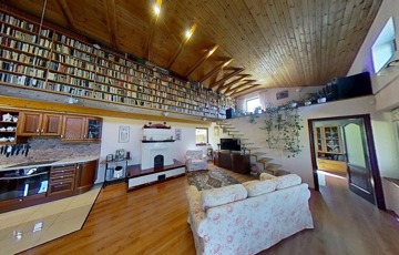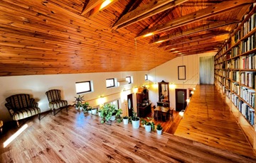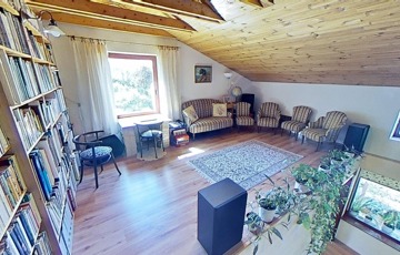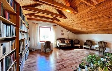 Az emeleten – mely látványos megoldásként szinte egybeolvad a földszinttel – található a galéria, 11 m hosszú könyvtár és a másik hálószoba. Igény szerint a galéria szobává alakítható.