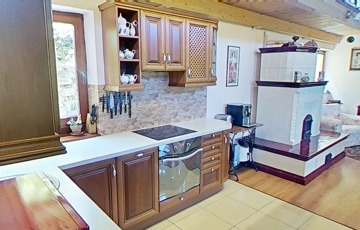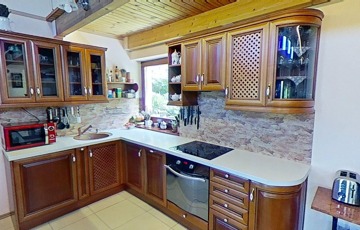 A cseresznyefa konyhabútor egyedileg gyártott, a beépített konyhagépek a vételár részét képezik.