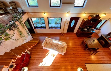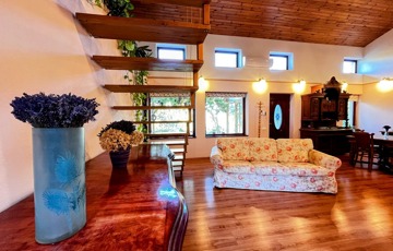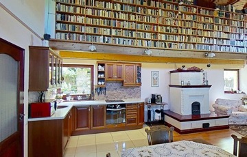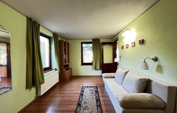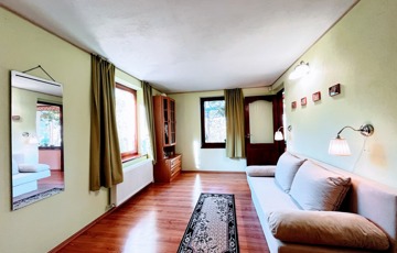 A földszinten helyezkedik el a tágas, nagy belmagasságú nappali, konyha, étkező, illetve az egyik, déli és nyugati tájolású hálószoba, a kétszemélyes sarokkádas fürdőszoba, és a kamra. A fényben fürdő, nyugati tájolású nappali közepén kapott helyett a díszes, egyedi cserépkályha.